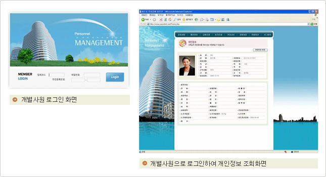 | 개별사원이 개별아이디로 로그인하여 공지사항, 사원정보수정, 급여조회, 휴가조회, 연말정산 자료입력 및 조회, 커뮤니티 사용이 가능합니다. |
