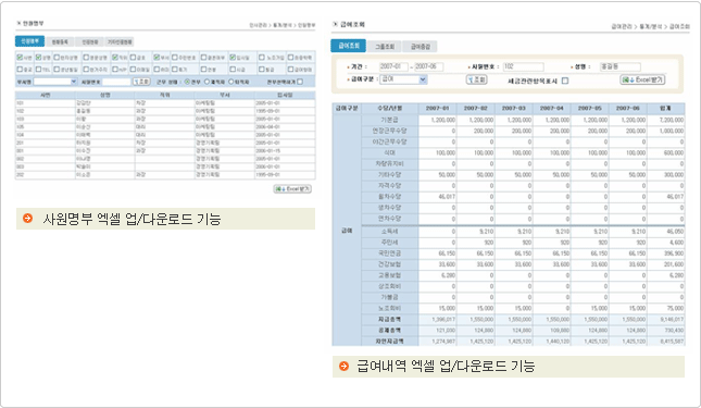 인사정보 및 급여데이터 등 대용량자료를 문서작업기능으로 엑셀파일로 프로그램에 업/다운로드가 가능하여 초기세팅 및 자료관리에 효율적입니다.