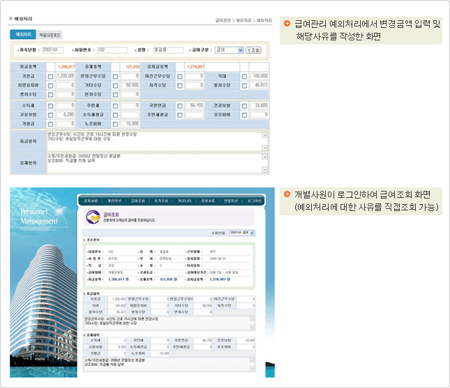 | 연봉제에서 호봉제, 월급제 등 다양한 임금형태로 적용하여 사용이 가능합니다. 그 외 연장근무에 따른 수당산정이나 인건비 원가산정도 적용 할 수 있습니다.