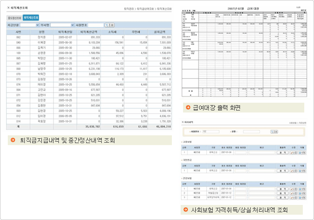 퇴직금중간정산 및 퇴직금내역 확인, 급여대장 DB화 및 파일로 출력, 사회보험 자격신고처리내역 확인이 가능하여 모든 자료를 전산화하여 관리하실 수 있습니다.