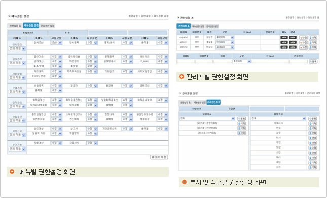 | 사용자에 따라 메뉴별, 페이지별, 부서별, 직급별 권한설정이 가능하여, 담당자별 조회 및 수정에 관한 권한을 구분하여 관리가 가능합니다. |